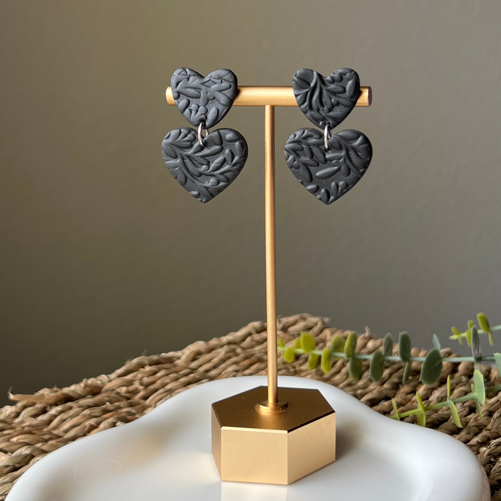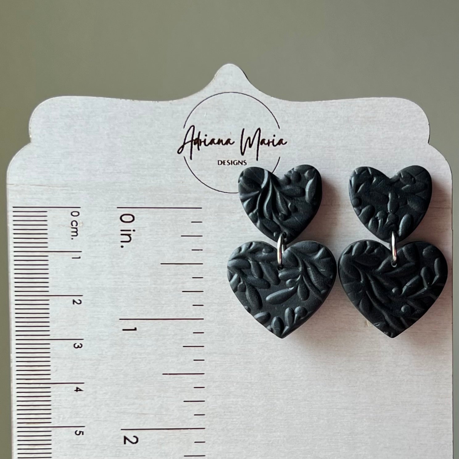 Black Floral Textured Heart Polymer Clay Dangle Earrings