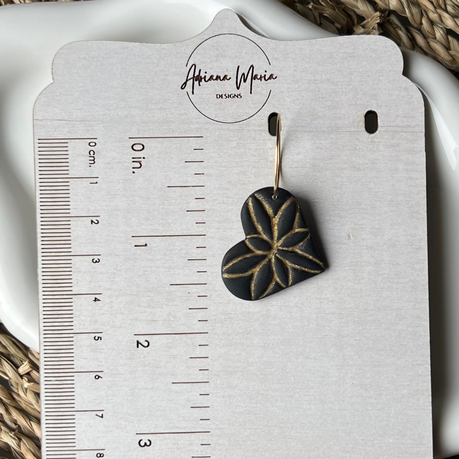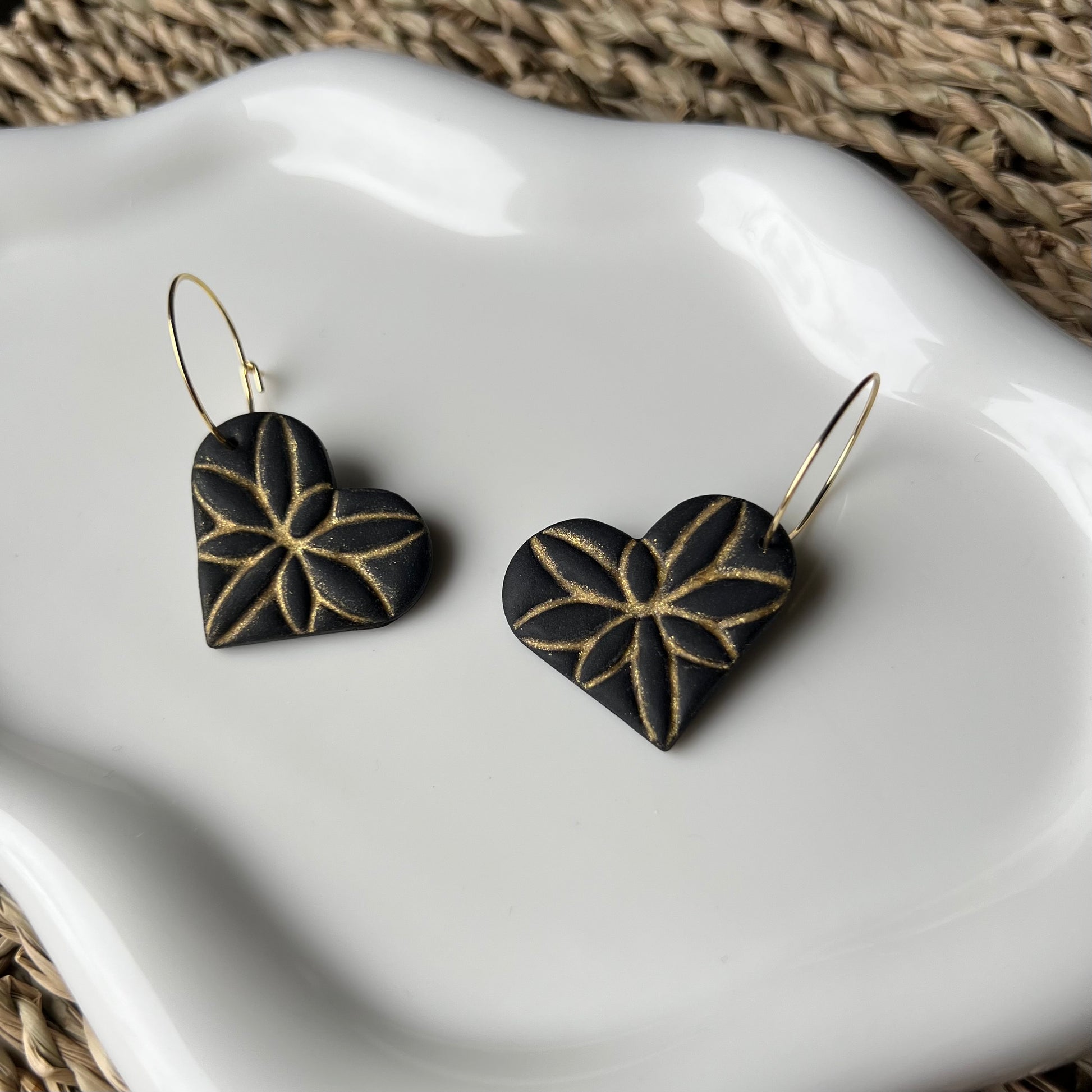 Black & Gold Heart Clay Hoop Earrings